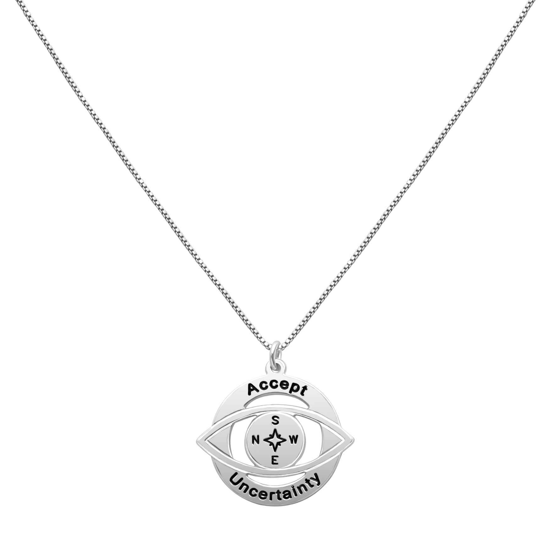 A perfect chain that shows us the way to Accept Uncertainty. It has the world as well as the eye and the compass. We are not on our own in this life journey. You can engrave 1 word on the back of the pendant