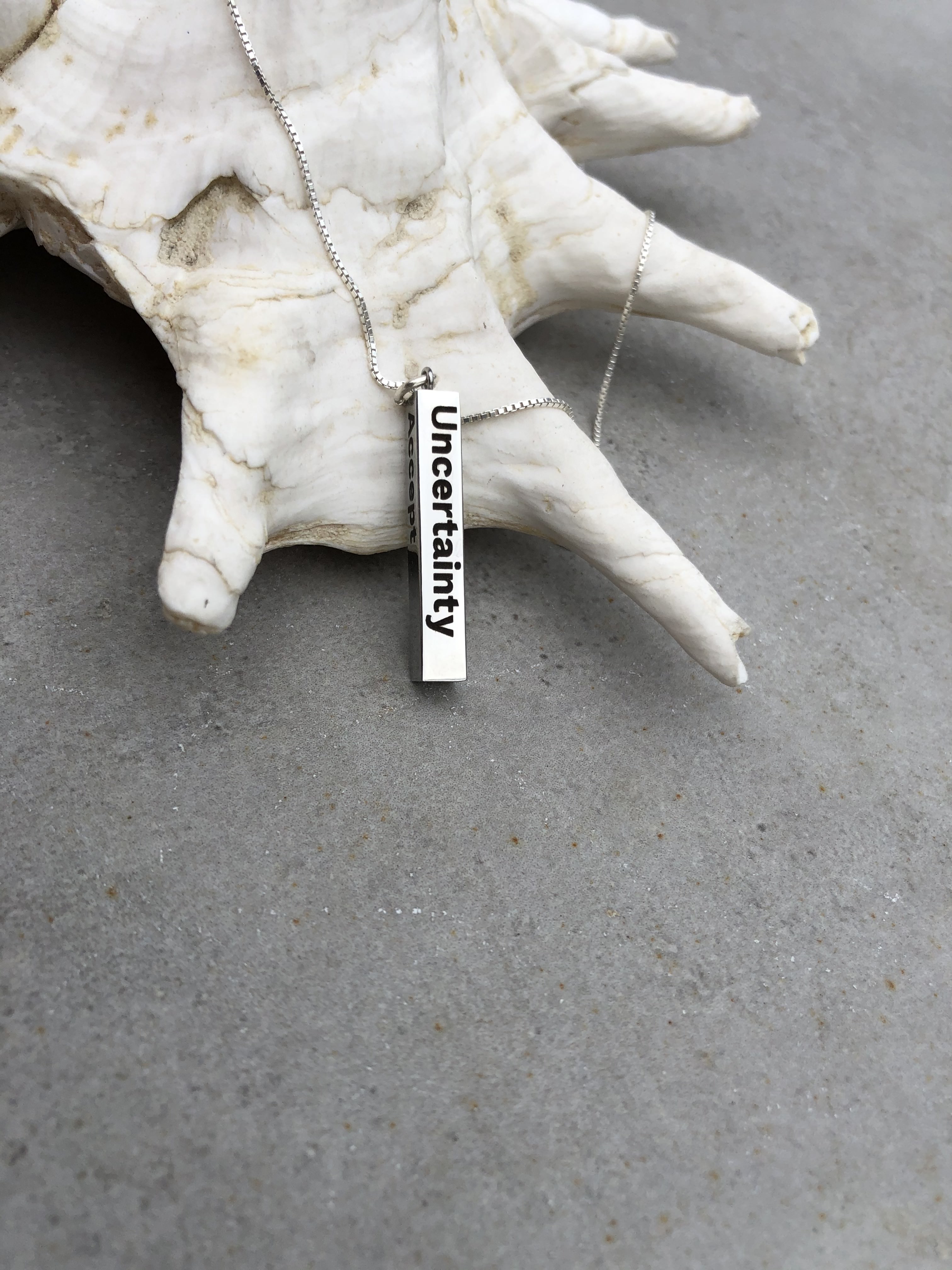 Unique 4 dimension bar necklace, meaningful yet delicate, that carries the message “Accept Uncertainty” and reminding us to move forward. It is possible to engrave two more words on two left sides.