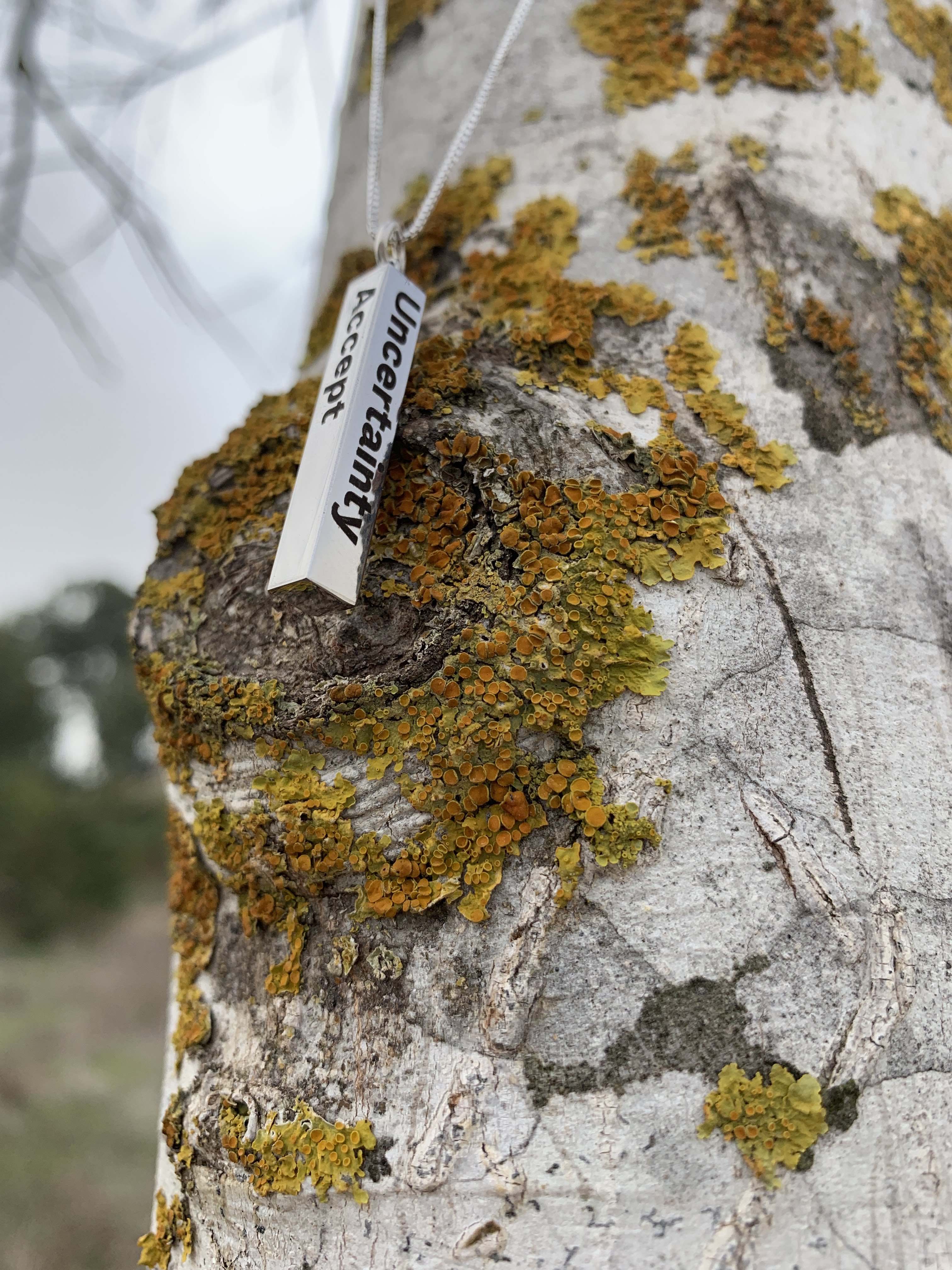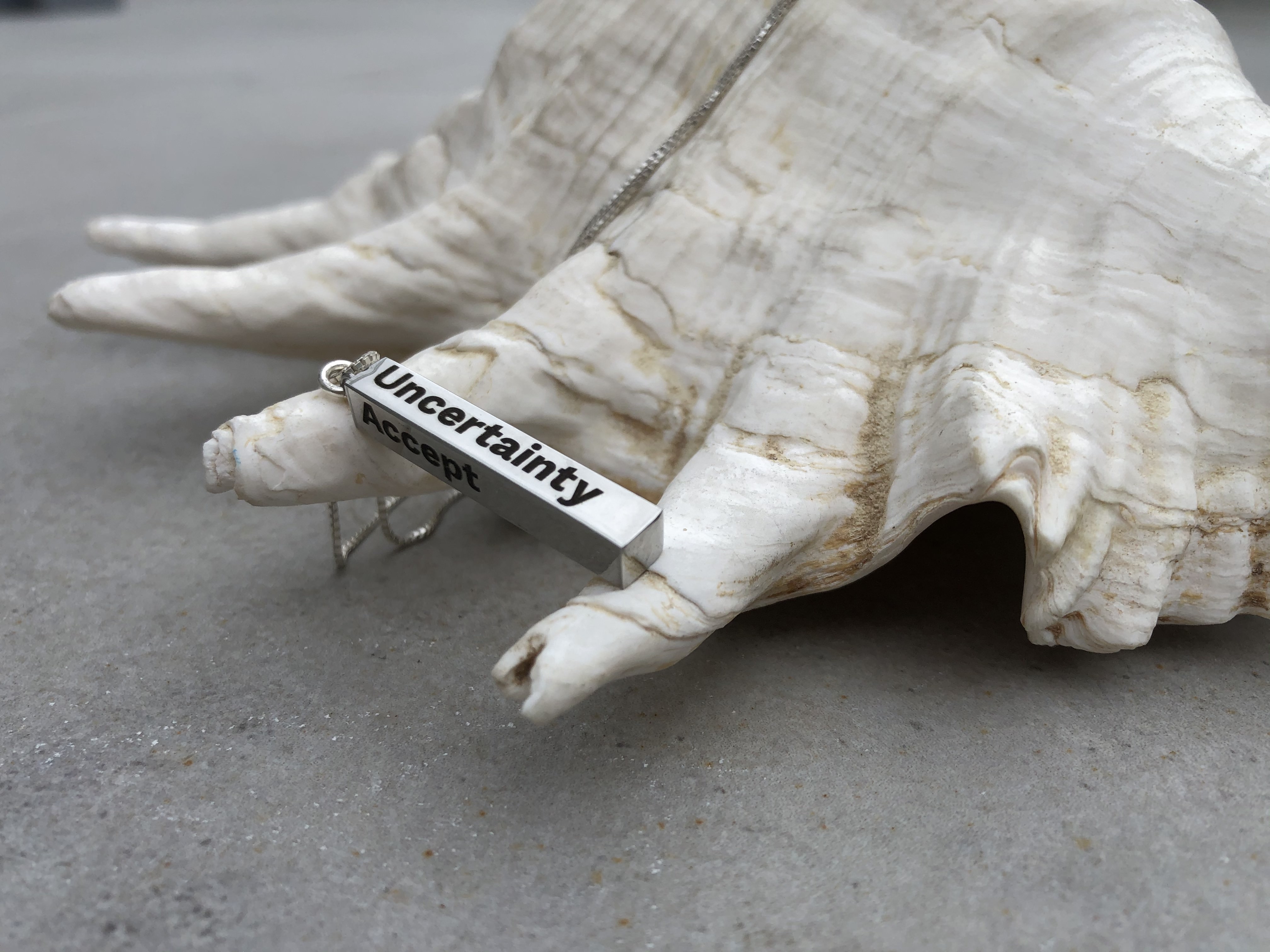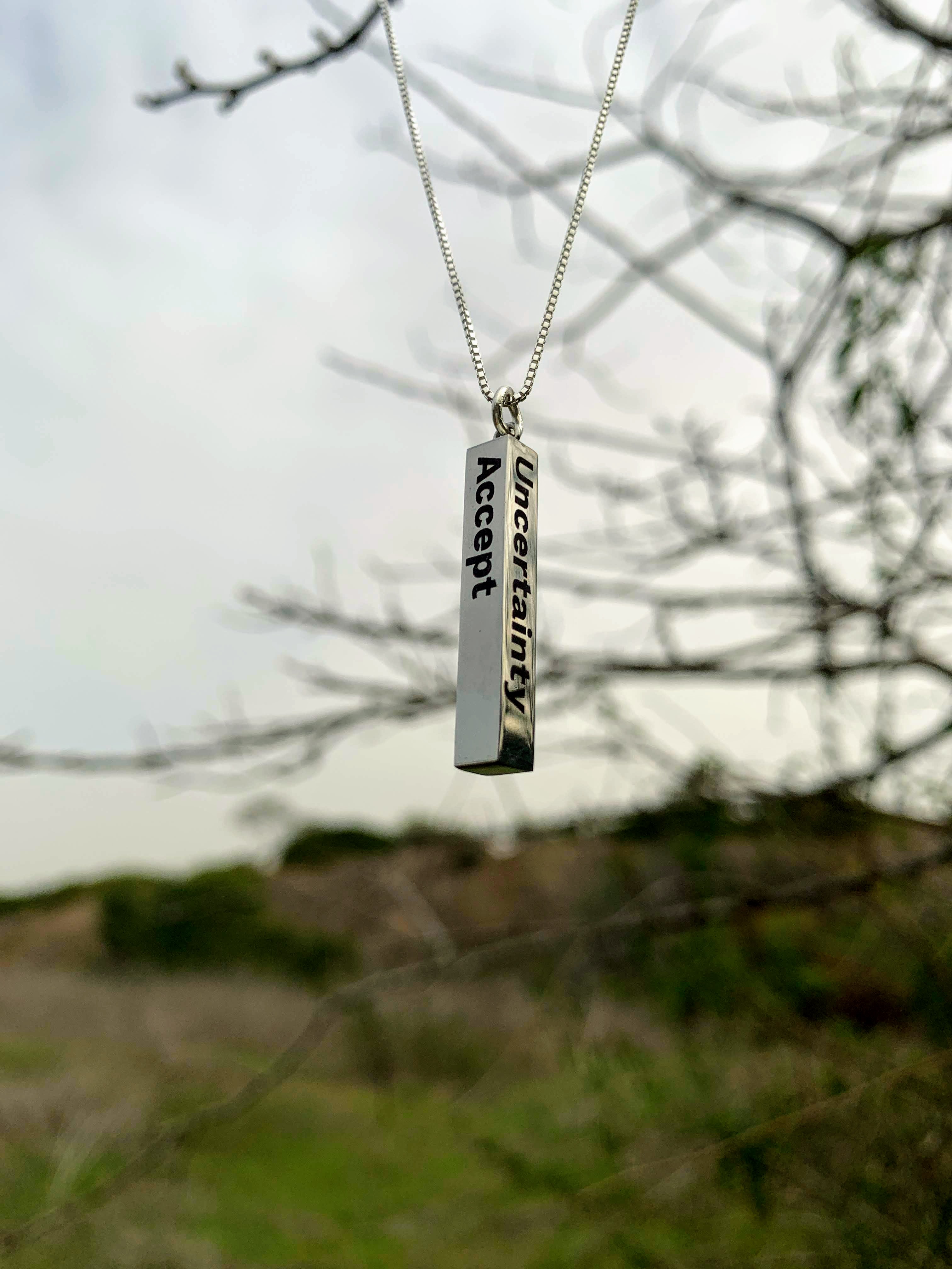 A delicate stainless steel necklace that carries the phrase Accept Uncertainty to help us feel and move forward