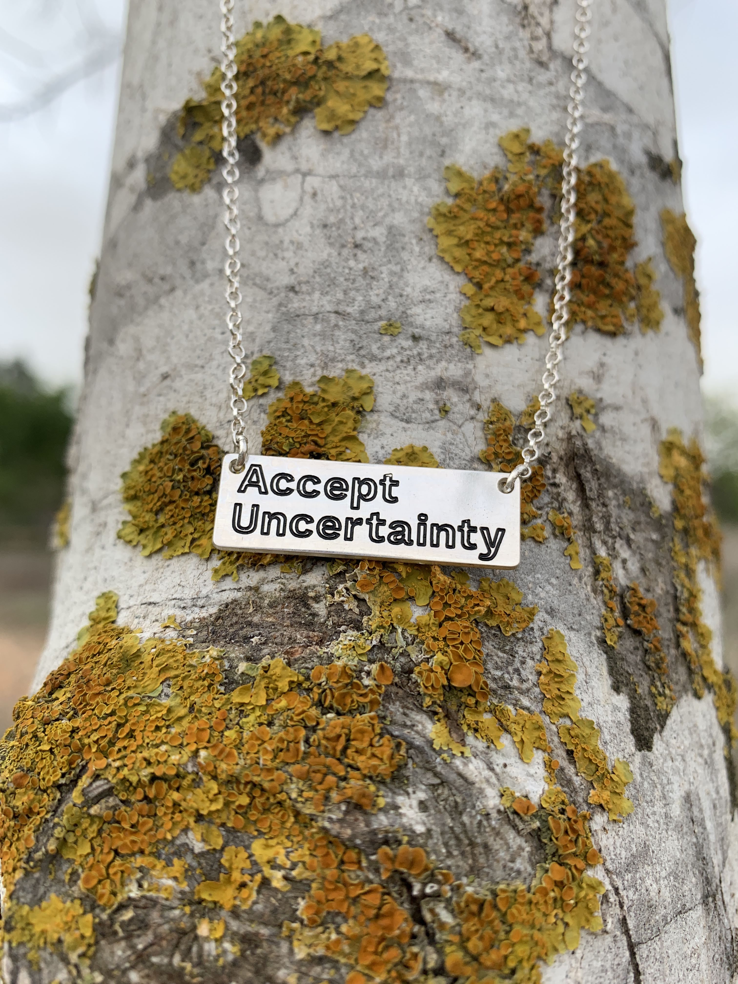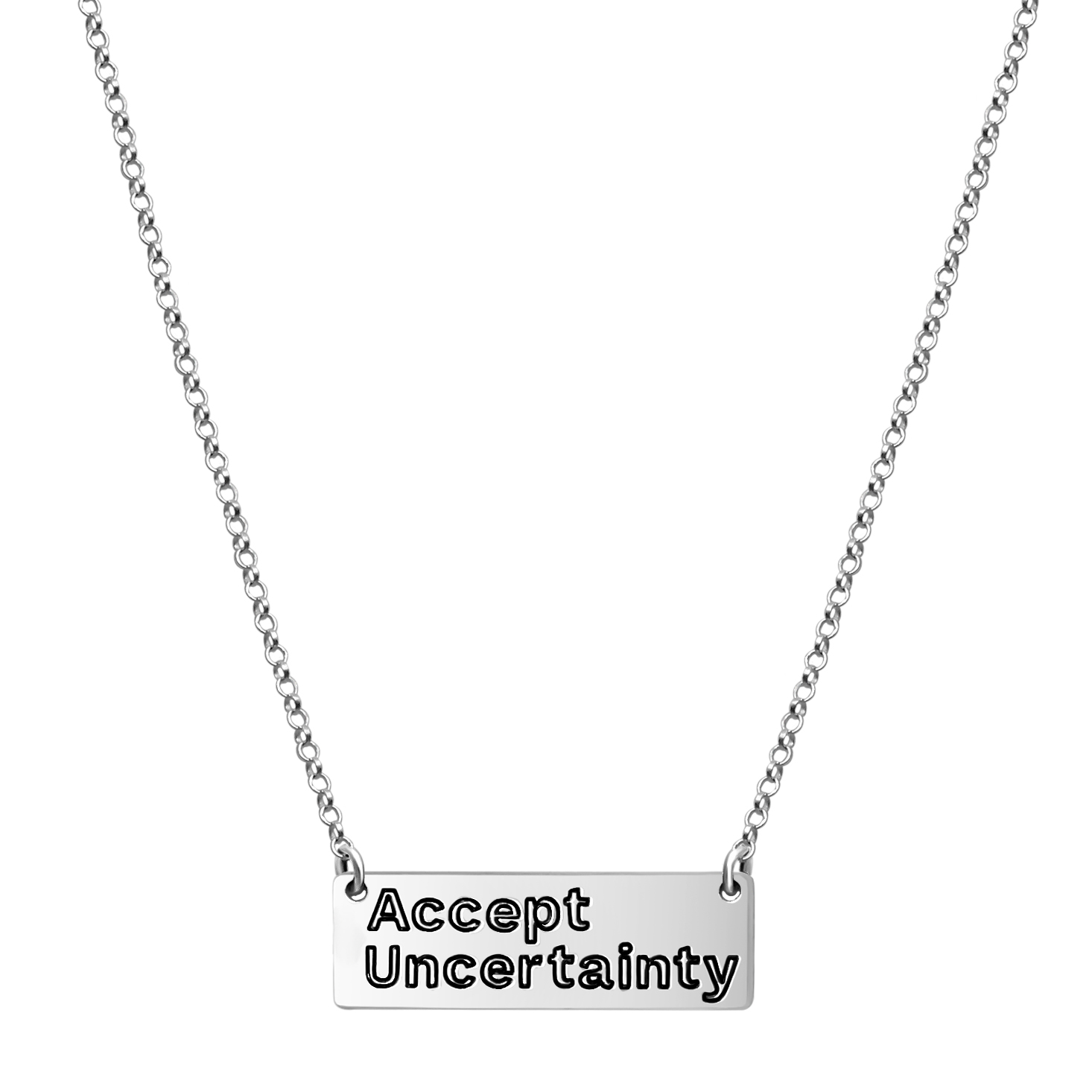 A delicate necklace that carries the phrase Accept Uncertainty to help us feel and move forward
