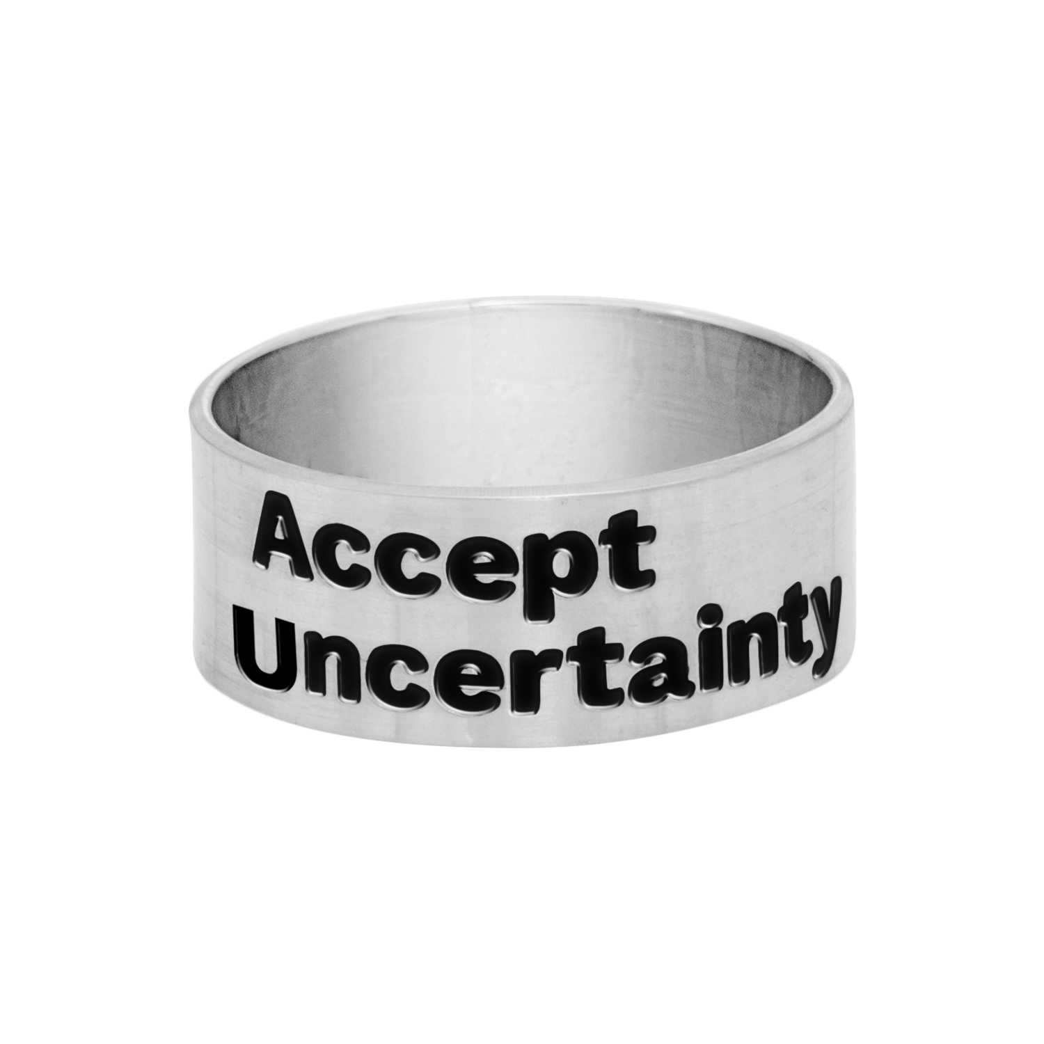 Wide silver 925 ring that reminds us to Accept Uncertainty in the deepest and most secure places. Suits women and men.