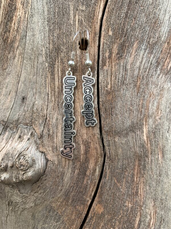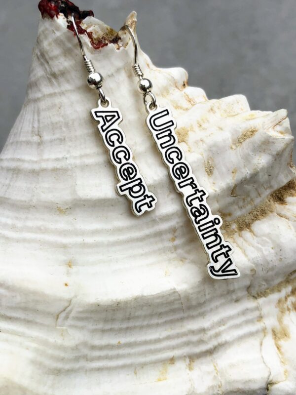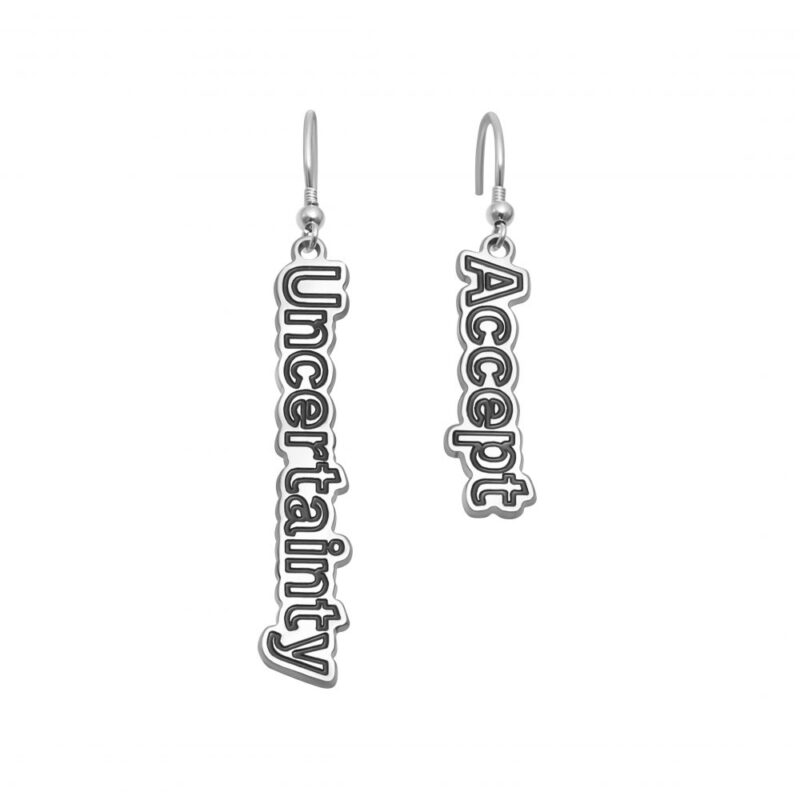 זוג עגילים מיוחד, לא סימטרי, כאשר בכל אוזן רשום חלק אחר של קבלת אי הוודאות. מאמינה שננסה אחרת, נשמע את מה שמעבר.
