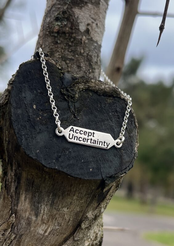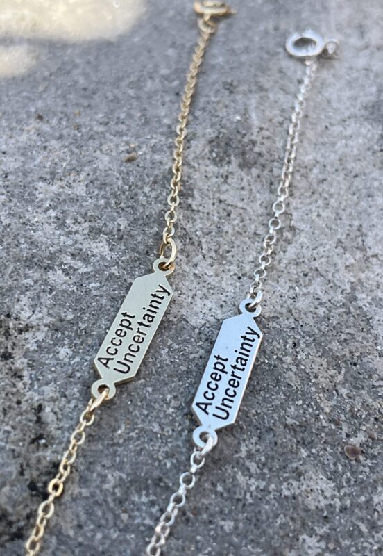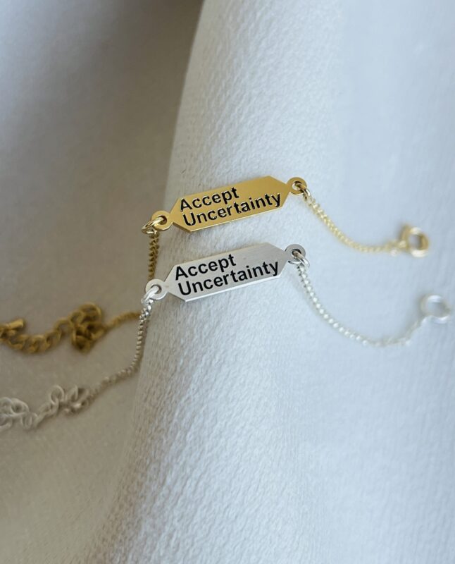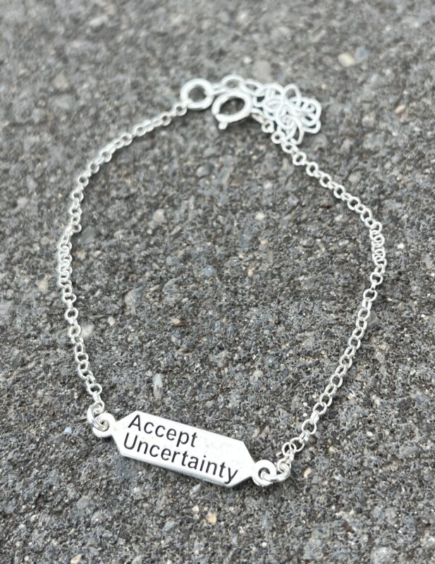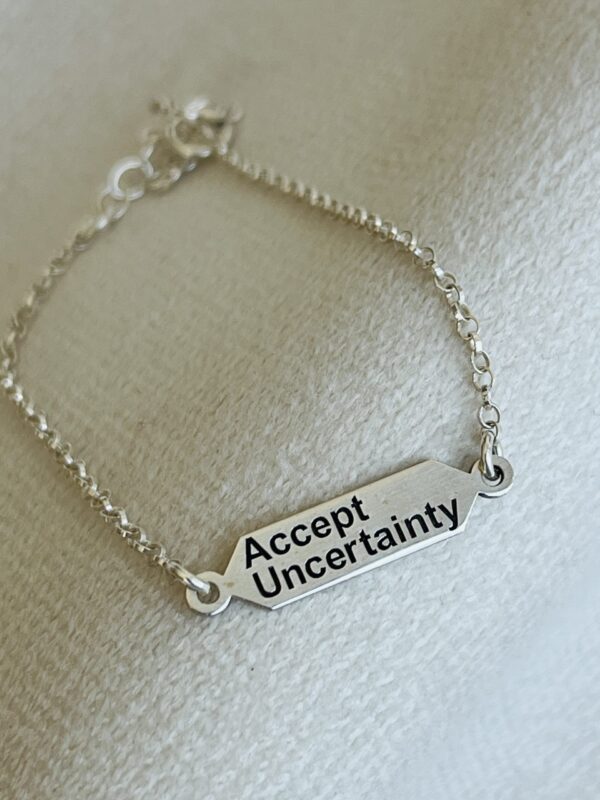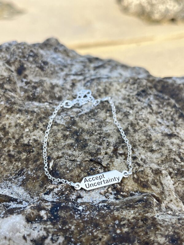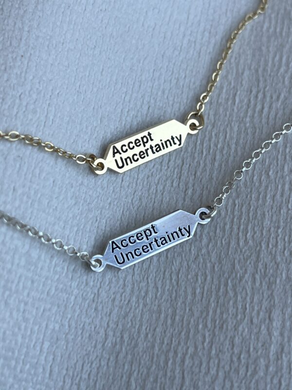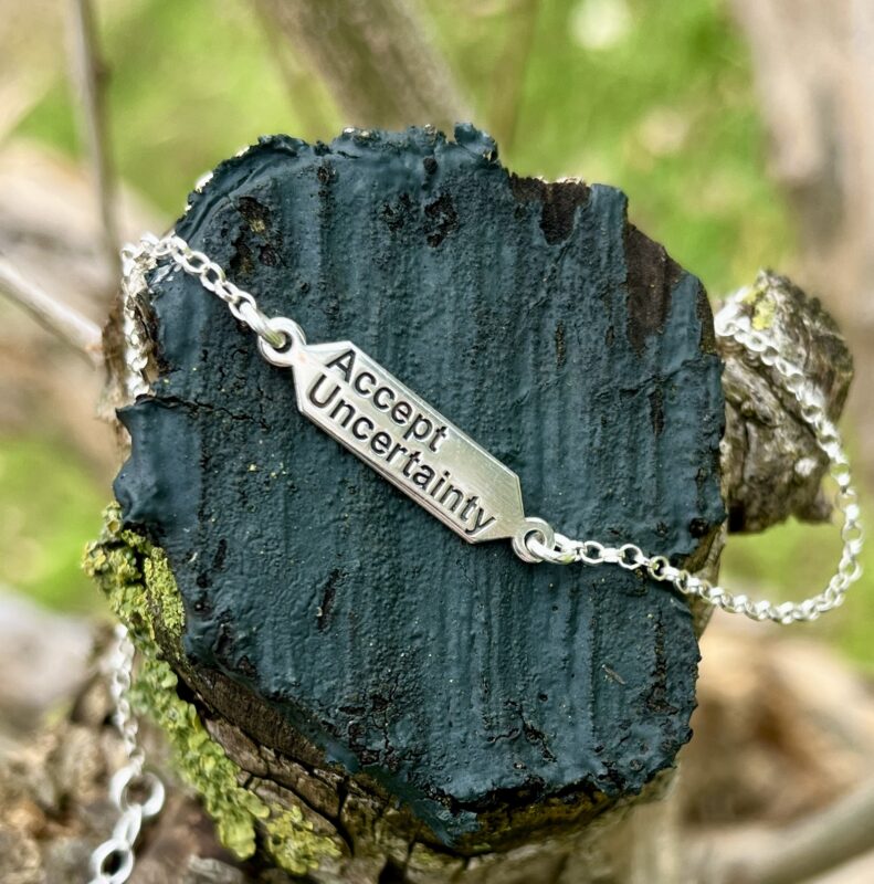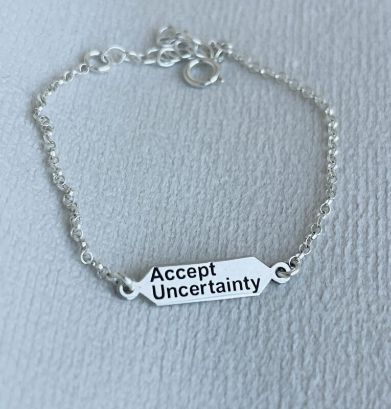 חרוטות עליו המילים: "Accept Uncertainty" – לקבל את אי הוודאות.